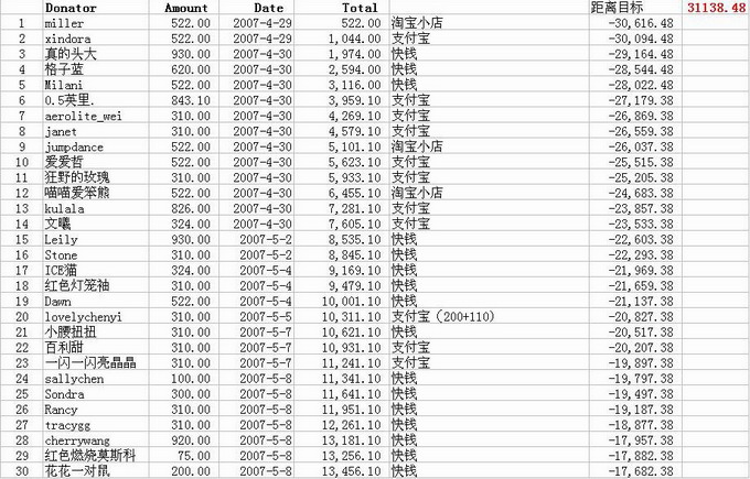 2、截止到2007年11月29日,捐款总金额为41138.48元