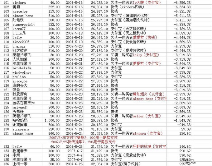 (xindora于2008年3月13日和kulala于3月25日说明:美金兑现后,到帐金额510美金,兑换汇率7.0933,手续费100元人民币,最后实际到帐人民币3517.58元,再扣手续费17.50元,汇给信天3500元)