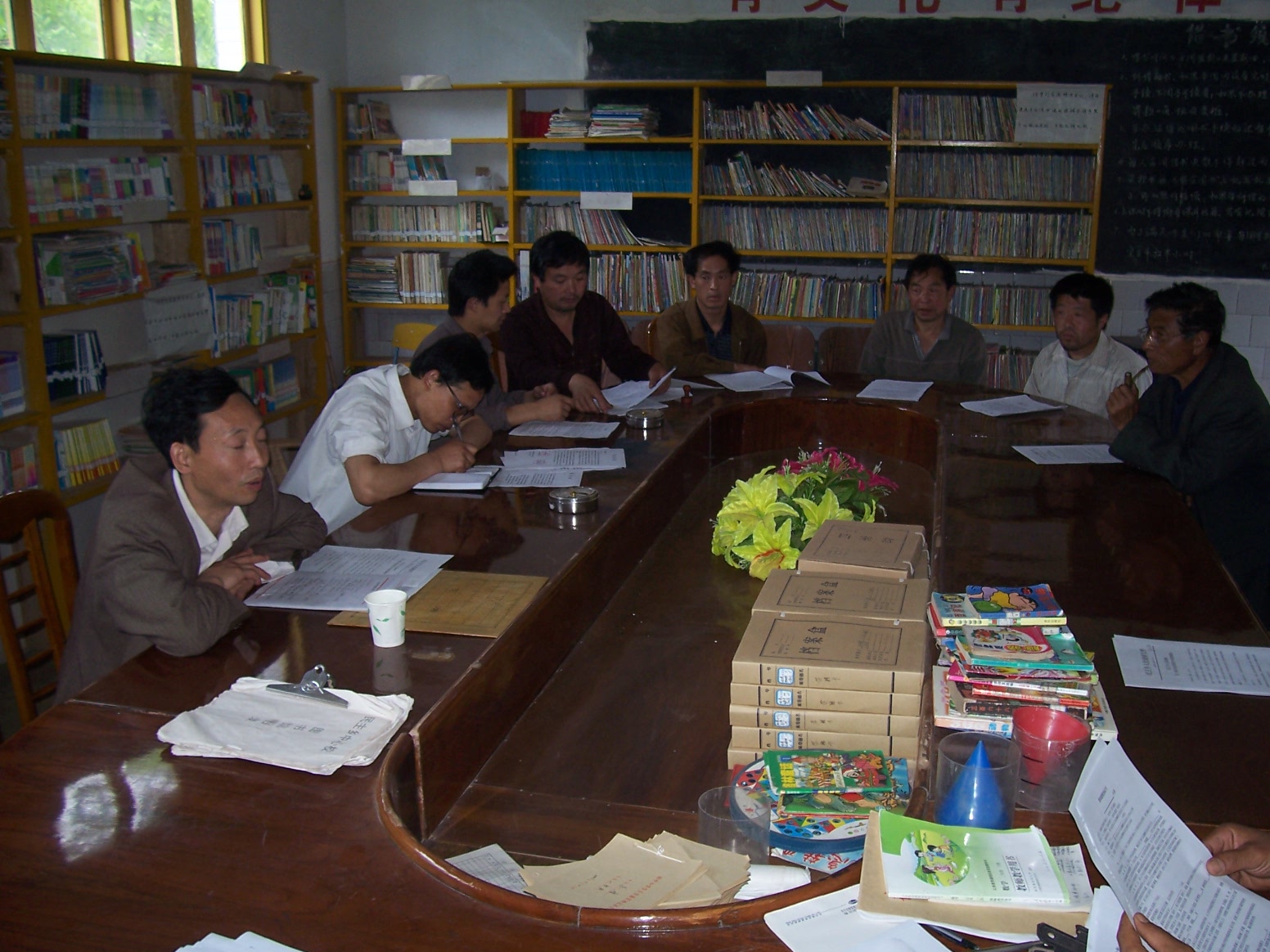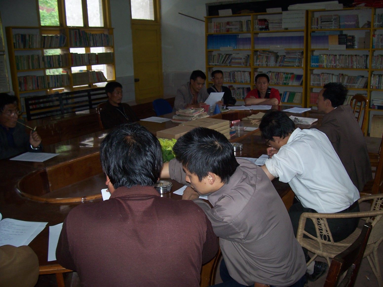 民主乡群众和学校非常重视社会力量来帮助解决村校的危房改造,乡政府和中心小学专门成立了领导小组来组织建设学校的工作,图为各村干部到学校来具体商议建设学校的事情,签署协议,在施工中保证安全、质量……