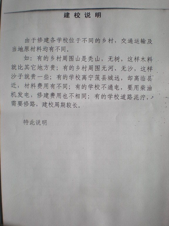 备注:由于修建各学校位于不同的乡村,交通运输及当地原材均有不同。