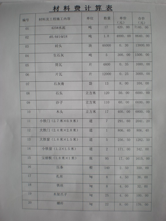 1.     水泥(425#)   吨   17   420.00   7140.00