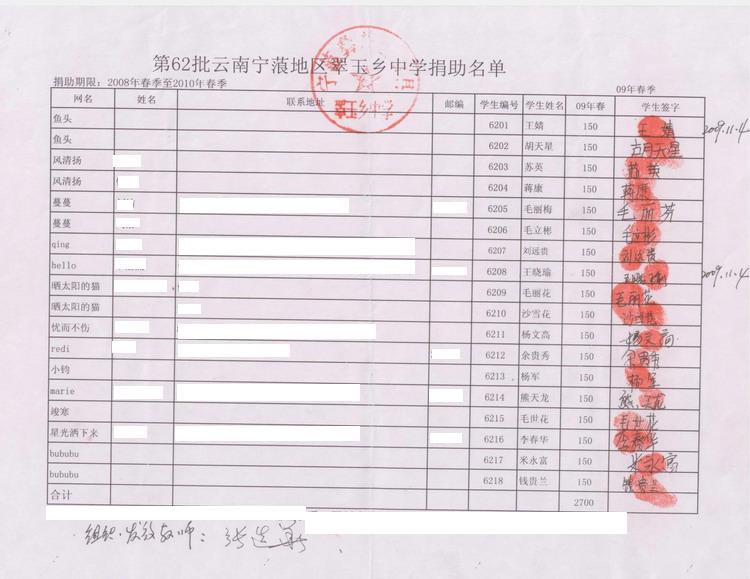 6、全部捐助款到凌之这里后,她会按学期分次汇给浦理智老师,浦理智老师和学校的负责老师再分发给受助学生(学生每学期收到150元),一一签字确认。知识改变命运,愿这些学生将来不再重复父辈们那艰辛苦难的日子。