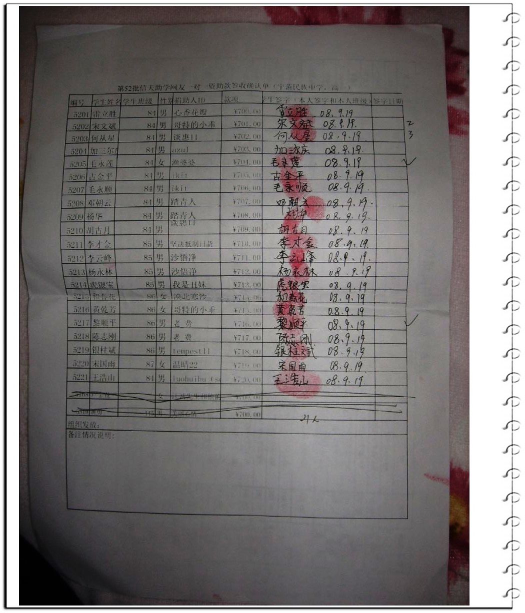 第52批信天助学网友一对一 汇款情况汇总(宁蒗民族中学,21名高中,2008年9月第二次汇款,高二学年的资助款)