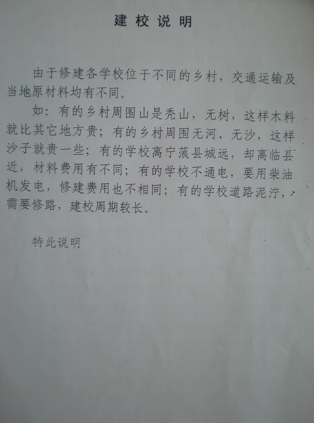 如:有的乡村周围山是秃山、无树,这样木料就比其他地方贵;有的乡村周围无河、无沙,这样沙子就贵一些;有的学校离宁蒗县城远,却离临县近,材料费用有不同;有的学校不通电,要用柴油机发电,修建费用也不相同;有的学校道路泥泞,需要修路,建校周期较长。