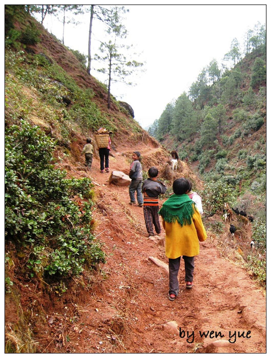 公里山路就要我们自己走啦,我倒还好,就只有随身的相机包,本想替曹师傅背背篓,他不让,说是太沉了;而那块校牌,我掂了掂,居然拎不动。曹师傅说,你别动了,有