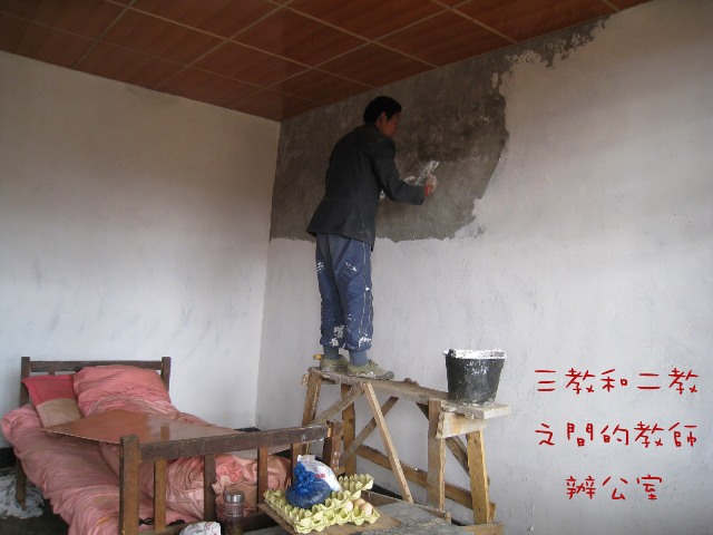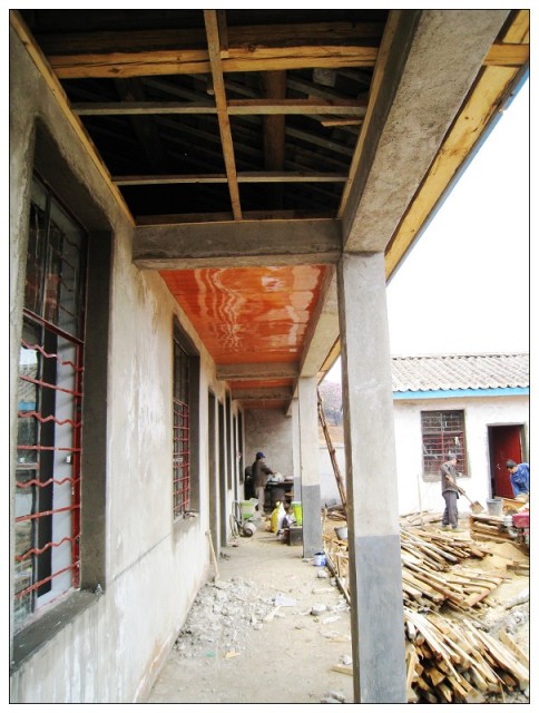 羊坪子村小是一座规模较大的学校,共有四个年级。校舍呈长方形,校门左边是厕所,右边是二间厨房,现在是工人师傅的临时宿舍,三间教室和二间办公室一字排开。右边的三教正在做地平;二间教师办公室正在刷墙;左边的一教和二教正等待刷墙和吊顶。这是我看到的条件最好的村小了,连走廊里都有吊顶。