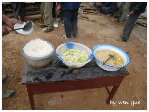走廊尽头,一名工人师傅正在做饭,不一会儿,热气腾腾的饭菜就做好了。卷心菜,鸡蛋汤,装在脸盆里端上了桌。对于都市人来说,这样的饭菜、这样的“碗碟”过于简陋,我和工人师傅们却吃得很香。没有桌椅,师傅们干脆端着碗蹲在地上,我不习惯蹲着,破例享受坐在床边吃饭的待遇。