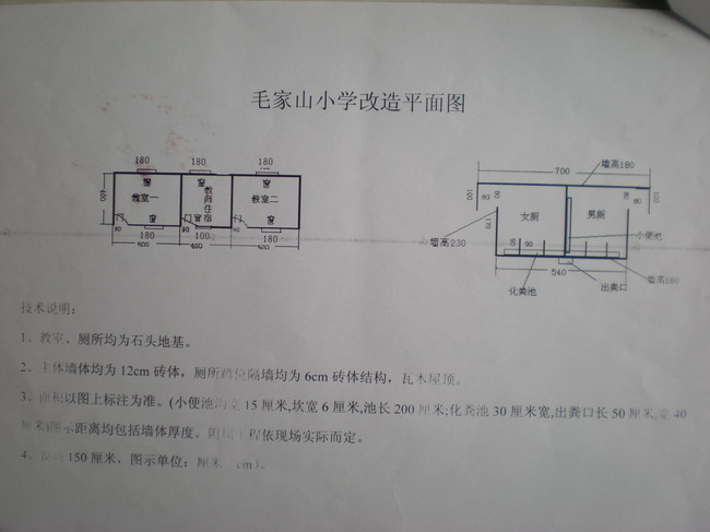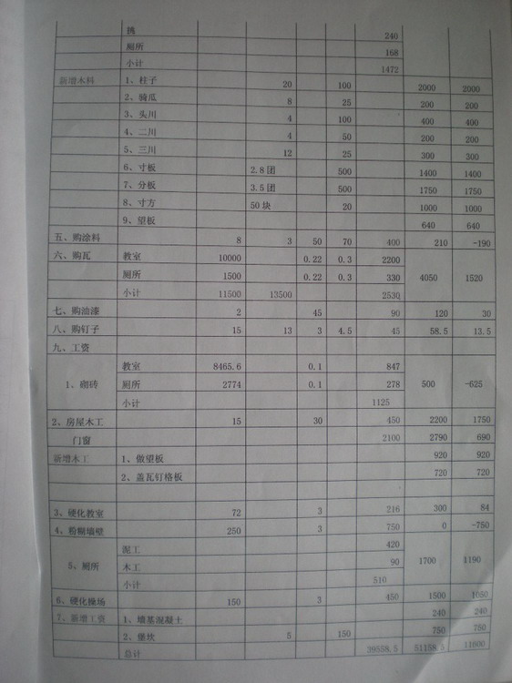 5、修厕所    原计划砖木结构,泥工和木工只有510元,后改为木结构,减少用砖,四周用木制板壁,框架也是木柱的,全包木工师傅工资1700元,计超支1190元;