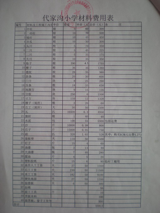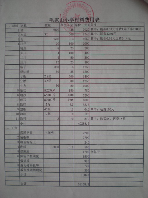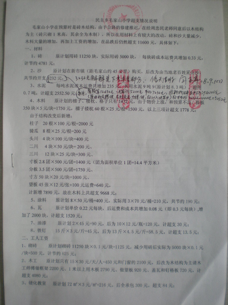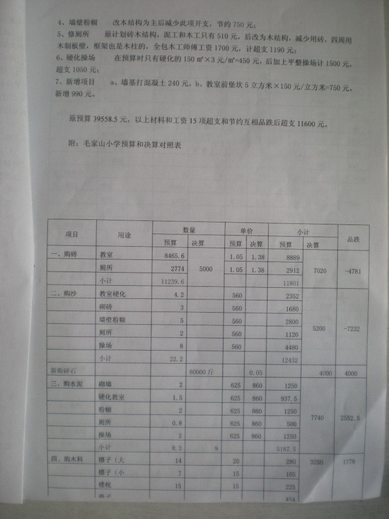 毛家山小学在预算时是砖木结构,由于公路的修建推迟,在经周忠民老师同意后以木结构为主(砖只砌1米高,其余全为木制),所以在用材料上有较大的改动,砖和沙大量减少,木料大量的增加,再加上工资的增加,在品跌后仍然超支11600元,具体如下: