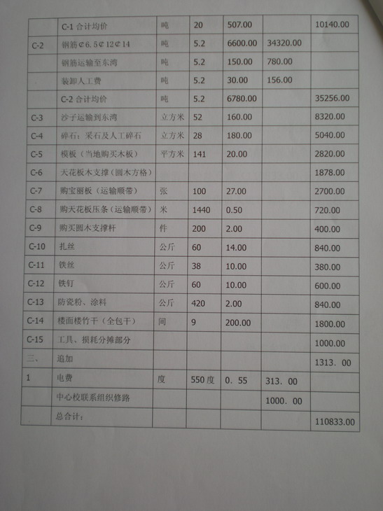 二、材料 按照在东湾小学施工的到场价格计算(含运输费用,民主乡属于马边县偏远的乡,运输费相对较高)