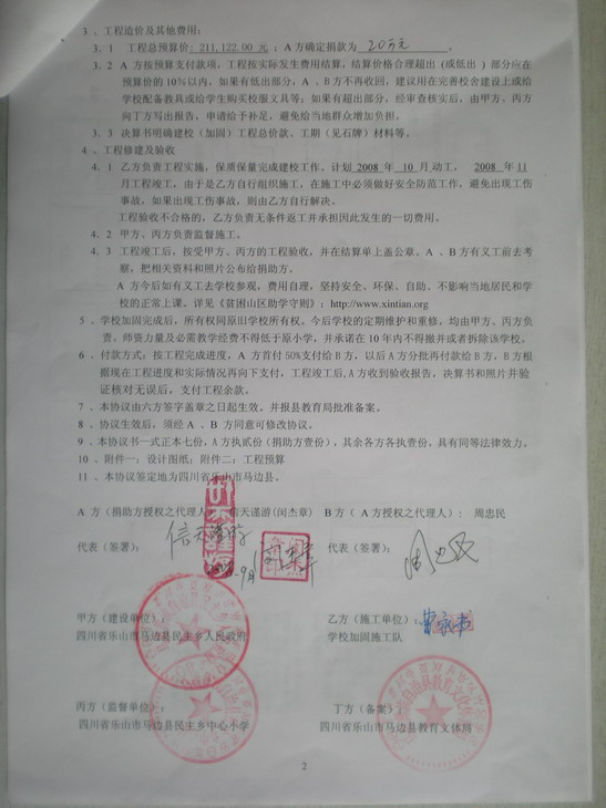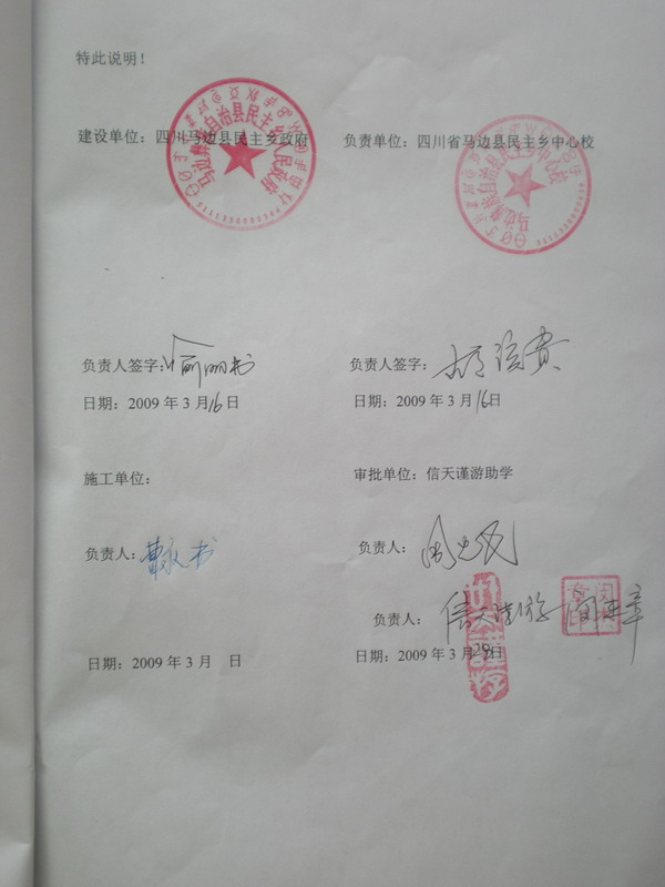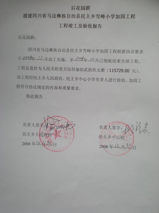 5、    工程竣工后,受托人向授权方提供乡政府及乡中心完小出具的丰产小学和雪峰小学的加固验收报告,决算书和照片。