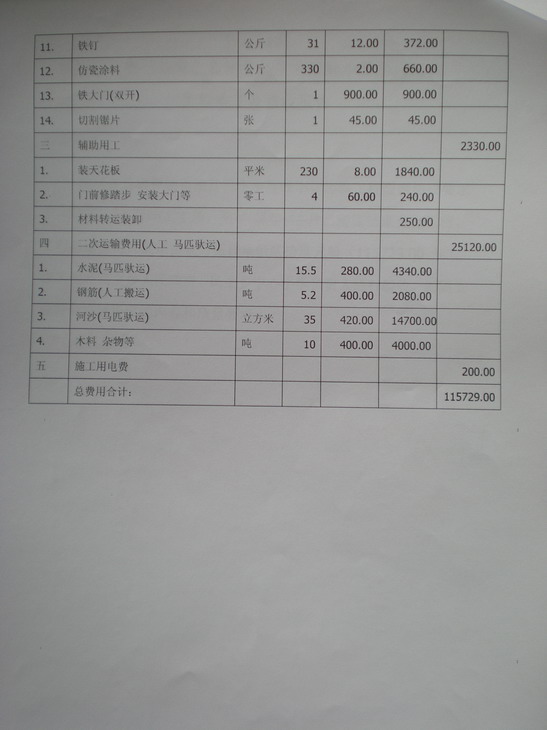 二、        按照在丰产小学施工的到场价格计算(含运输费用,民主乡属于马边县偏远的乡,运输费相对较高,丰产比东湾更远)