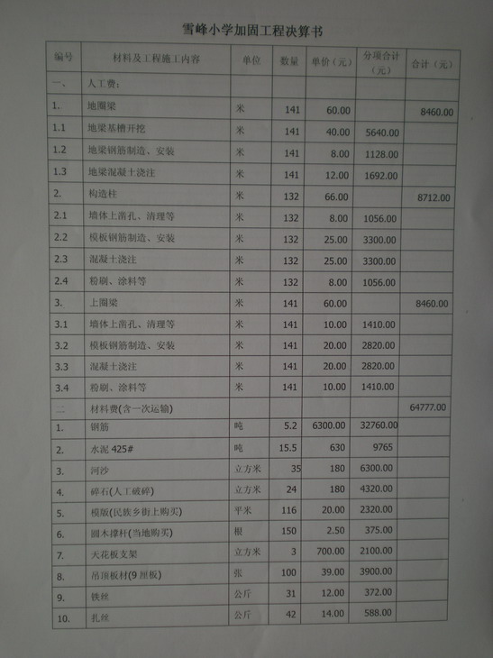 马边县民主乡雪峰小学加固工程预算(后花园群捐助)