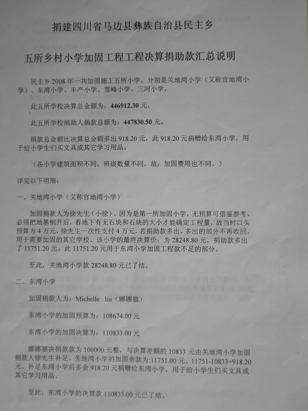 第一步先加固民主乡的小学,随后对老河坝乡、袁家溪乡、下溪乡的村小进行加固。(以上活动及施工方案均得到当地政府认可支持)。