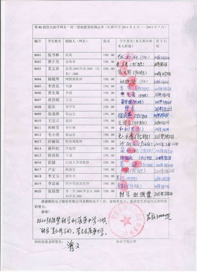 红桥中学86批(2011年3月到2011年7月)受助学生签收单: