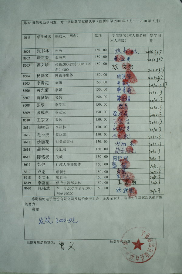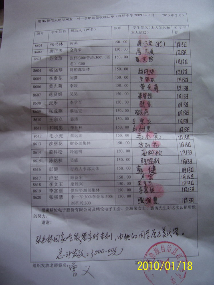 2、本批初中三年六个学期的款项,热心网友苏无名联系精伦团捐,一次性汇款18000元给漫步轻灵,漫步轻灵收到后后,她会按学期分次汇给浦理智老师,浦理智老师和学校的负责老师再分发给受助学生(学生每学期收到150元),一一签字确认。
