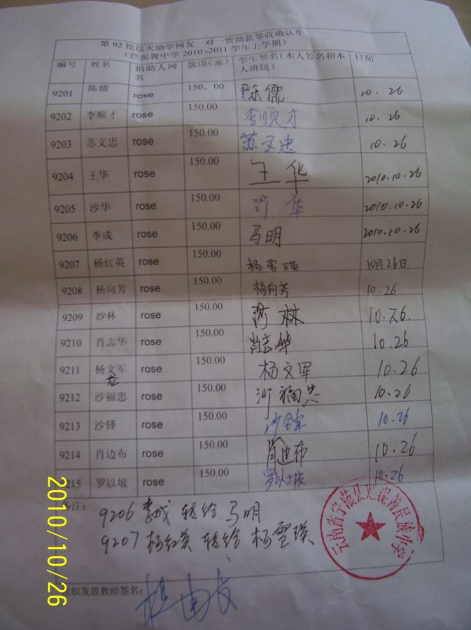 烂泥箐中学92批(2010年9月-2011年2月)信天助学款发放签名表