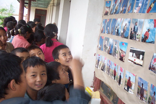 这样的午餐,不但学生们天天吃,老师们这样吃,我们走访的时候,中午也是这么吃的,图为修建小学临时工棚里的午餐:地上那几个黑疙瘩就是烧熟的土豆,右边的碗里就是喝的茶叶水,左边那个白碗放的是炒熟的面粉,碗边三片树叶就是勺子,增添了几个人,没有勺子就用树叶替代。