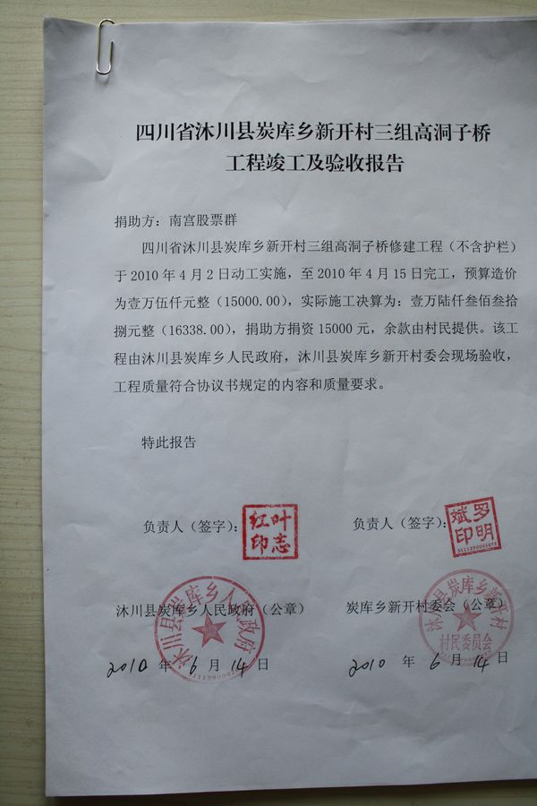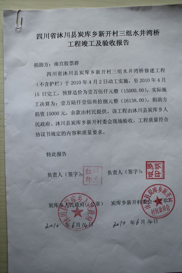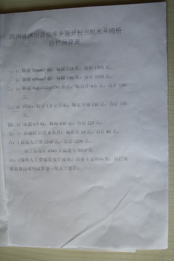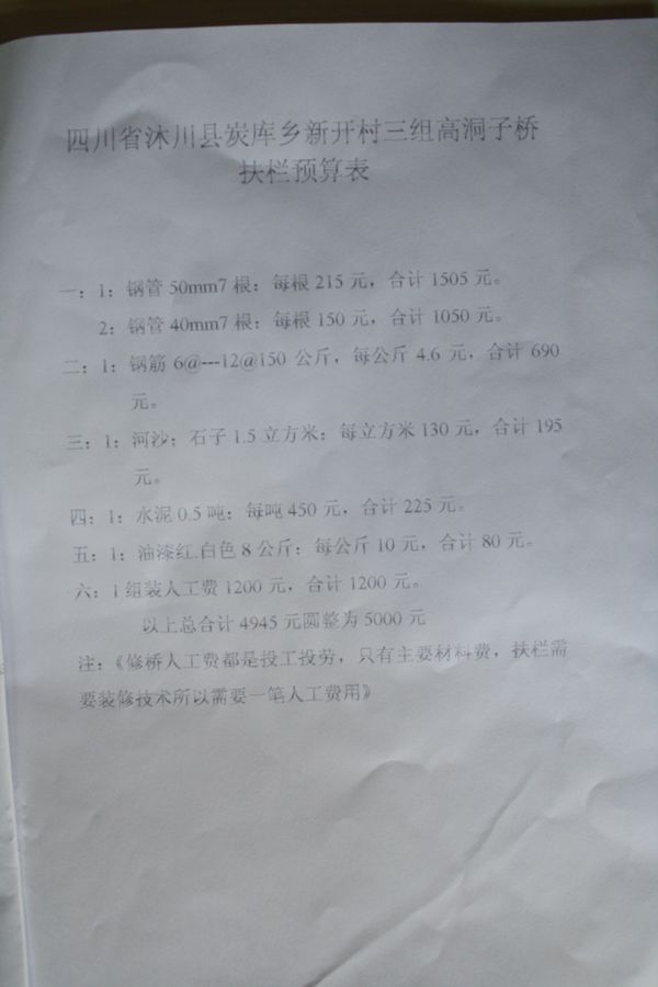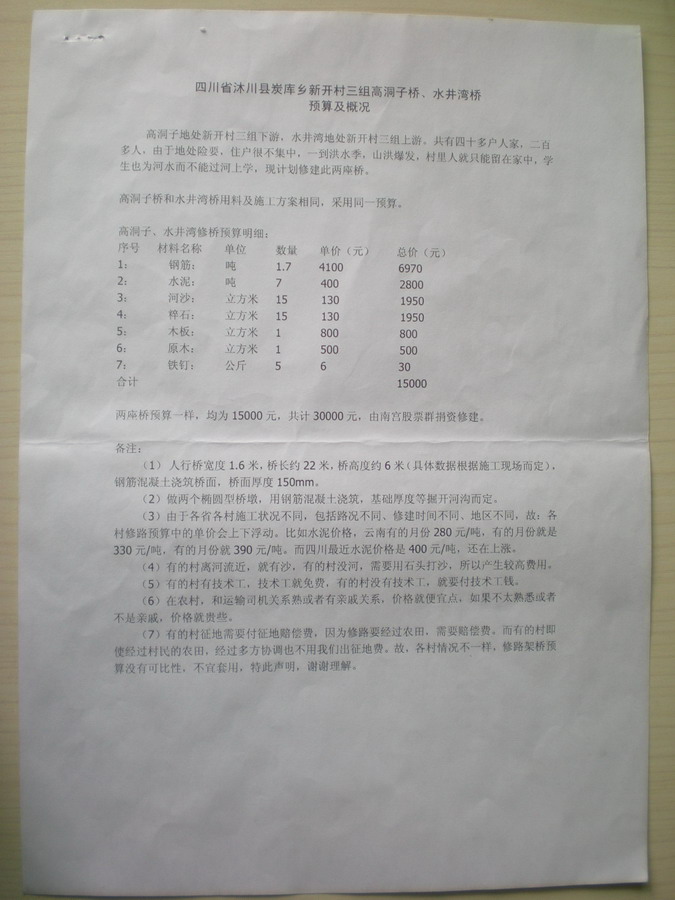 备注:(1)由于此两座桥位置山涧中,离河面很高,竣工后,村民希望两边能加上护栏,起到安全作用,后与南宫股票群协商,两座桥增加护栏,增加预算1万元,由南宫股票群捐资,修护栏照片见第4、5页