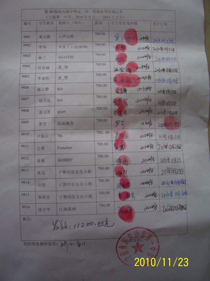 9917 宁蒗一中203班 毛 青(5920) 十月 2010年11月6日 建行 3200.00