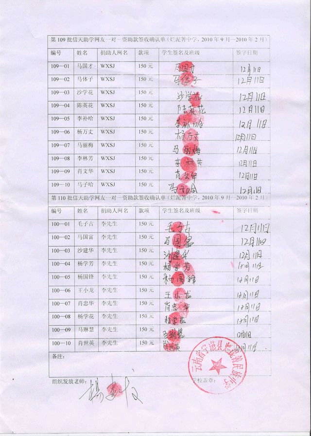 烂泥箐中学109批和110批(2011年3月-2011年7月)信天助学款发放签名表