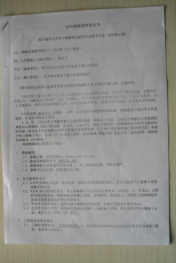 全路合价74940元,资助方资助54940元,余款由村民集资和投工投劳处理。