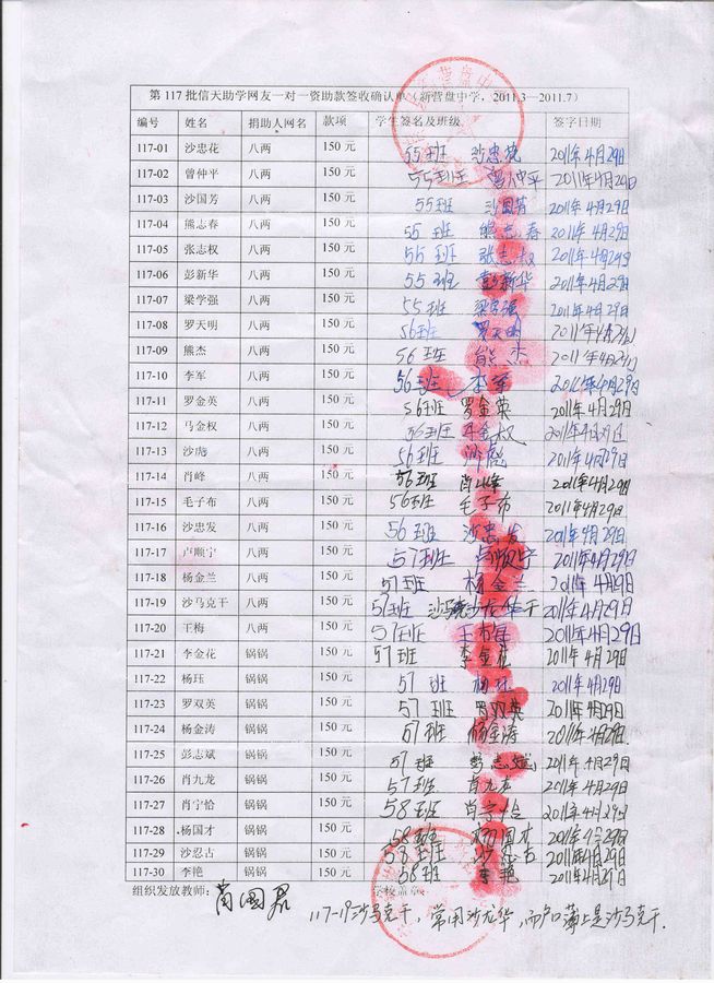 初一年级学生,编号117-01----117-30:资助款为750元/人,一次捐出(五个学期),2011年3月----2013年7月,共五个学期,一个学期150元。
