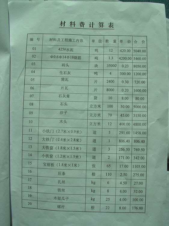 1) 水泥(425#) 12吨*420.00元/吨 5040.00