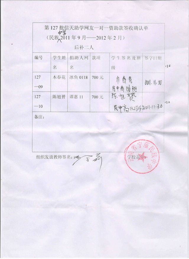 备注:由于上次漏发两位学生的资助款,现已补发,签收单上两位受助生的编号编入127-09 木春花,127-10 陈旭赟,谢谢理解!