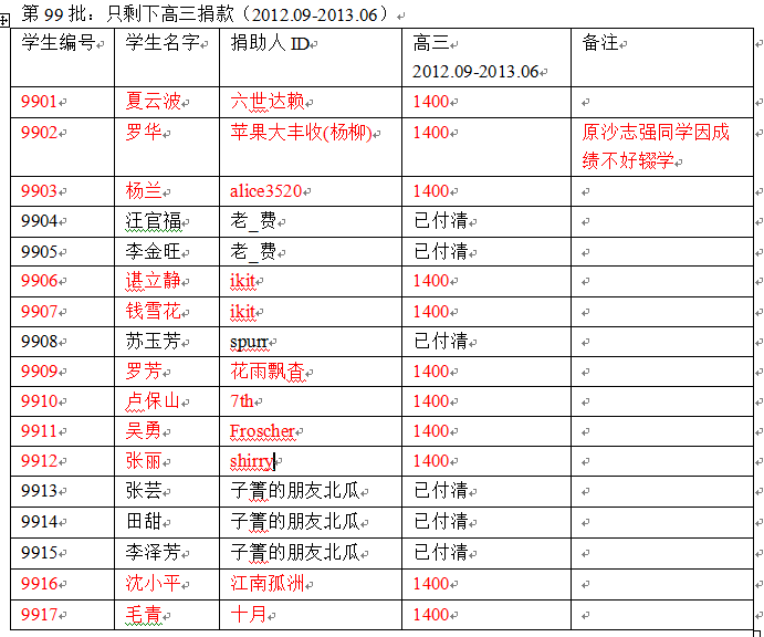 (二)、第99批(宁蒗一中高中续捐受助学生,编号为9901- 9917的受助生在2012年9月升入高三年级),已经收取了2010-2012年度高一、高二学年的资助款。目前将收取编号为9901-9915的学生高三学年的资助款,均为1400元/人。(在天涯旅游信天助学版)http://www.tianya.cn/techforum/content/680/672.shtml