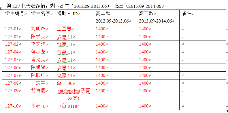 (八)、第127批(宁蒗民族中高中资助学生,编号为127-01至127-10的受助生)天涯续捐。
