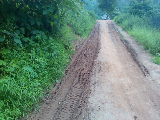 民主中小学校门口道路,这是天晴时拍下的照片,民主气候多 雨,一年到头,这条路随时泥泞不堪。