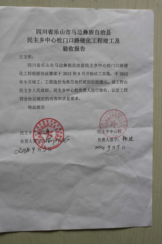 马边彝族自治县民主乡中心校和民主乡初级中学的教学区和教师住宿区离主干公路(到民主乡的唯一一条主干线)有150米,在2008年没有主干线时还是一条羊肠小道,主干道修通以后,民主乡中心校、民主乡初级中学为了师生进出方便,转包了一部分农民的承包地,请来挖掘机挖了一条长150米,宽5米的路。