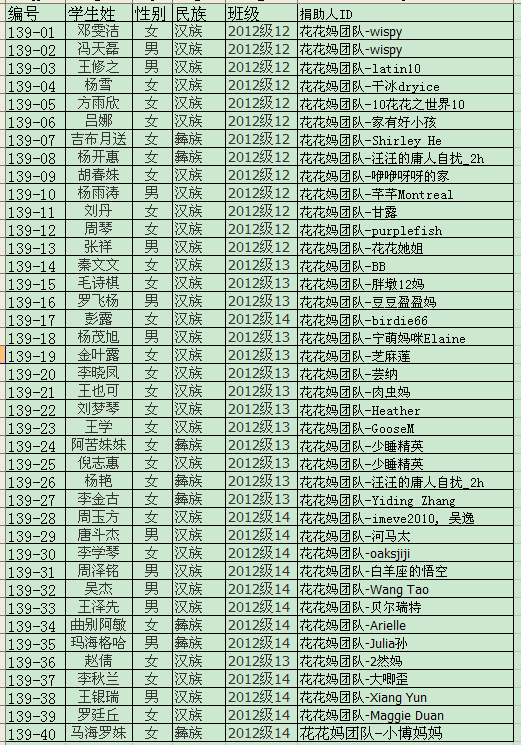 编号---------学生姓名------性别-----民族-------班级--------------捐助人