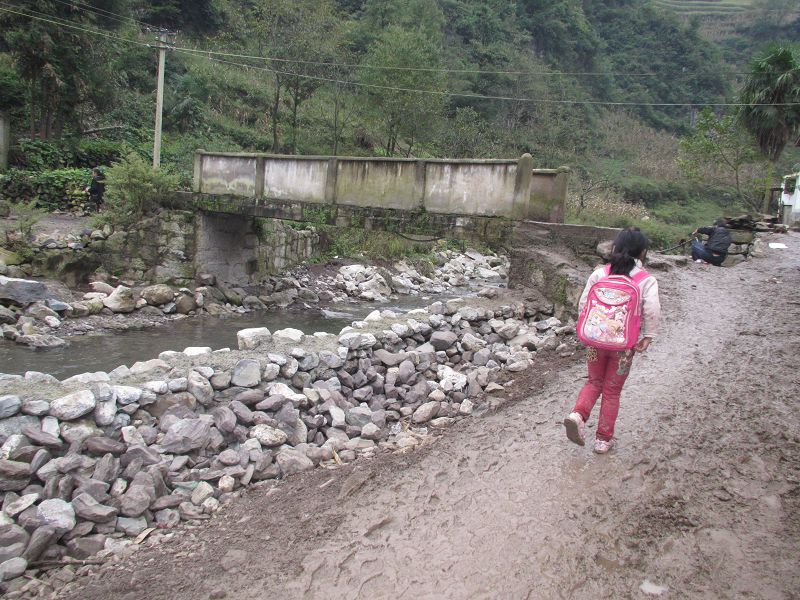 这个孩子所在学校是聚河小学,110多个学生中有40多个学生同这个女孩走的是同一条路,一下大雨,这条小河洪水暴涨,这个小学就会有三分之一的孩子无法到学校上课了……