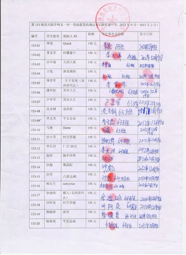 第153批新营盘中学(2012年9月--2013年2月)受助生签收确认单: