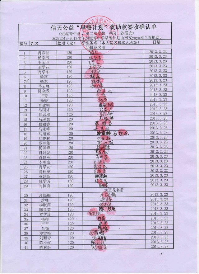 烂泥箐中学,2012-2013年早餐计划第二次发款签收单