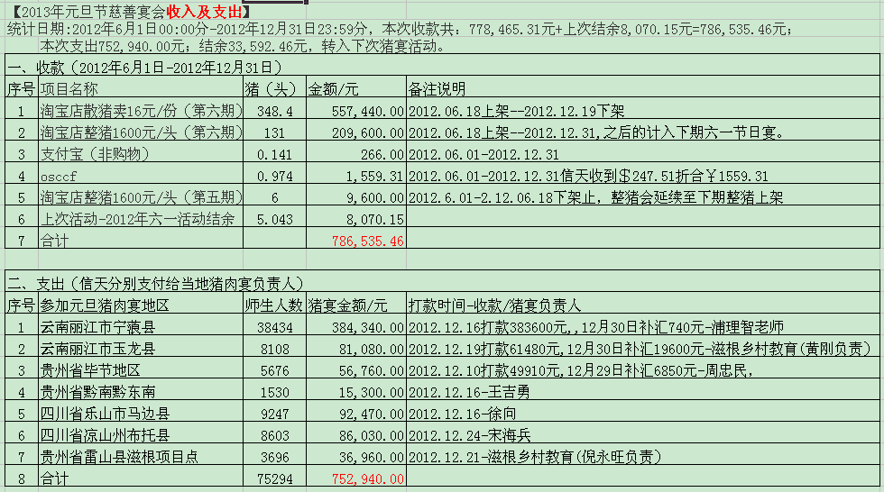 综上所述:本次2013年元旦猪宴结余款为:786,535.46元(收入)-752,940.00元(支出)=33595.46元,转入下次猪宴活动。