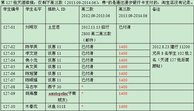 (二)、第127批(宁蒗民族中学高中续捐受助学生,编号为127-01至127-10的受助生在2013年9月升入高三年级),已经收取了2011-2013年度高一、高二学年的资助款。目前将收取编号为127-01至127-10的学生高三学年的资助款,均为1400元/人。(在天涯旅游信天助学版)