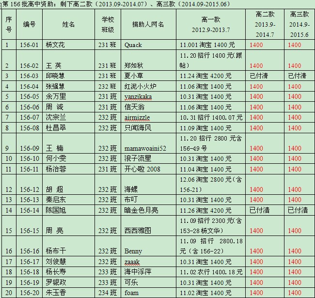 目前将收取编号为156-01至156-50以在2013年9月-2014年7月高二学年的资助款,均为1400元/人。(在天涯旅游论坛信天助学版和