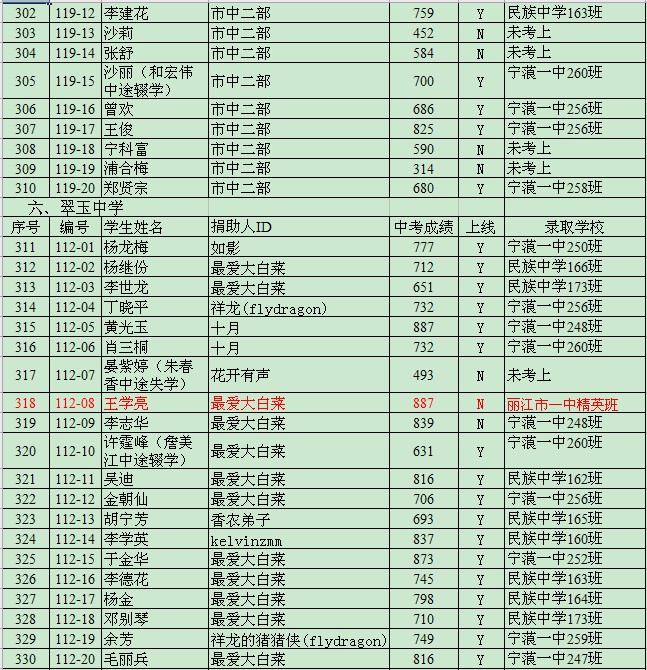 注:红色标记是考得较好的同学,被省城昆明或者地级市丽江的“名校”录取。