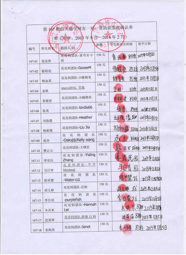 第167批翠玉中学(2013年9月-2014年2月)受助生签收单