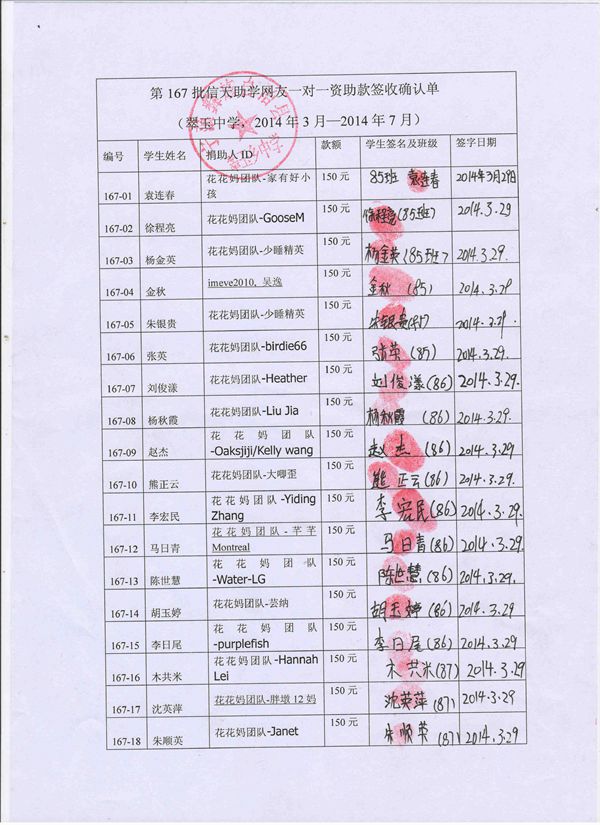 第167批翠玉中学(2014年3月-2014年7月)受助生签收单
