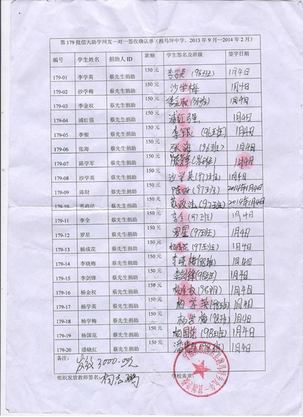 (2)我们会按学期分次汇给浦理智老师,浦理智老师和学校的负责老师再分发给受助学生(学生每学期收到150元),一一签字确认。知识改变命运,愿这些学生将来不再重复父辈们那艰辛苦难的日子。