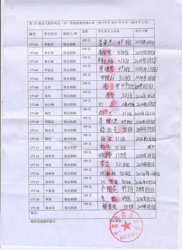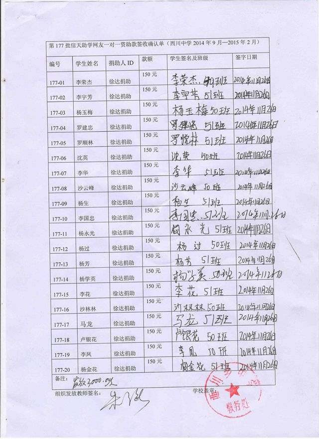 初一年级学生,编号177-01----177-20:资助款为900元/人,2013年11月----2016年7月,共六个学期,一个学期150元。