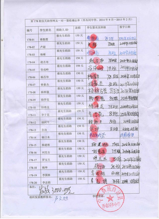 (2)我们会按学期分次汇给浦理智老师,浦理智老师和学校的负责老师再分发给受助学生(学生每学期收到150元),一一签字确认。知识改变命运,愿这些学生将来不再重复父辈们那艰辛苦难的日子。