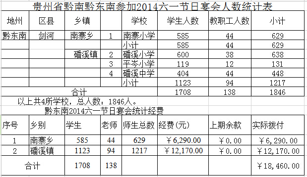熊宇处实际支出:10190元,熊宇处结余金额:600元,(因为贵州箐口小学60名学生没有参加此次活动。)此款将转入2015年元旦节日宴会活动之用.