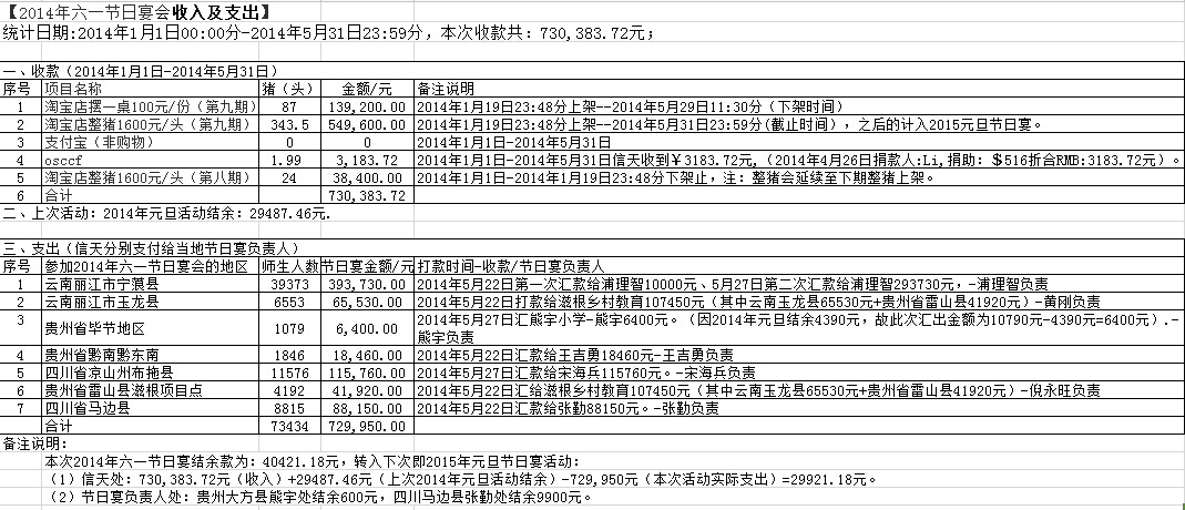1)通过osccf的节日宴款,只接收熟悉网友的捐款,捐款汇到osccf的款会在1-2个月再转到信天账上。2014年1月1日-2014年5月31日信天收到¥3183.72元节日宴款。(2014年4月26日捐款人: Li , 捐助:$516折合RMB:3183.72元)