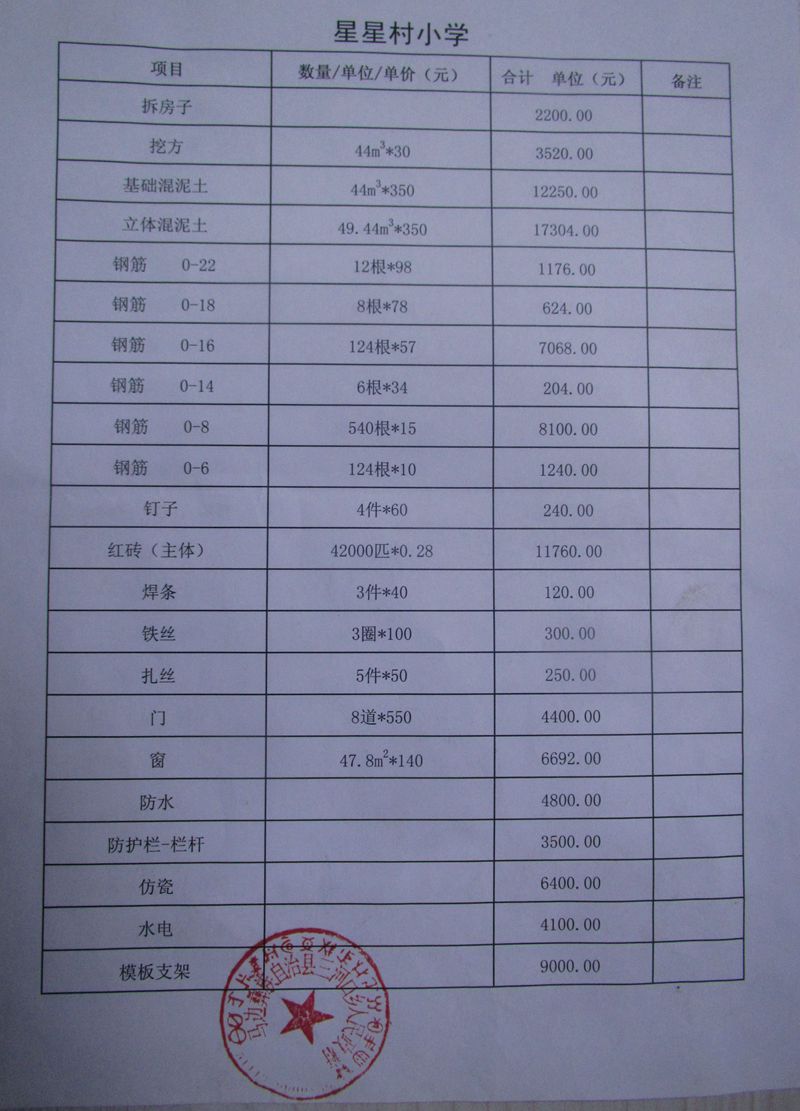 星星小学所在的星星桥存人口900多人,目前20多个学生,一位民聘教师,学校目前教室年久失修已经是危房(12墙),希望我们帮助在原址重建(3间教室、1间办公室、1间伙房,硬化100多平米操场、近60米围墙,一段堡坎以及校门国旗台等,上山道路难走并且需要二次搬运)。将来可以容纳1年级、2年级和学前班,总人数50多个,中心校承诺派来至少一位公办教师——原来教育局及中小学考虑过把这个小学并入对面月儿坝小学(目前3位公办教师56个学生,离开这里两公里多点,但要下山、通过吊桥过河),但村民强烈不同意,认为山路太难走,坏天气时孩子们就无法去学校了,我们今天也体验到了这里上山的道路,很好的天气,一台越野车,熄火8次,还是只能在半山腰停下,我们步行上山去学校的。