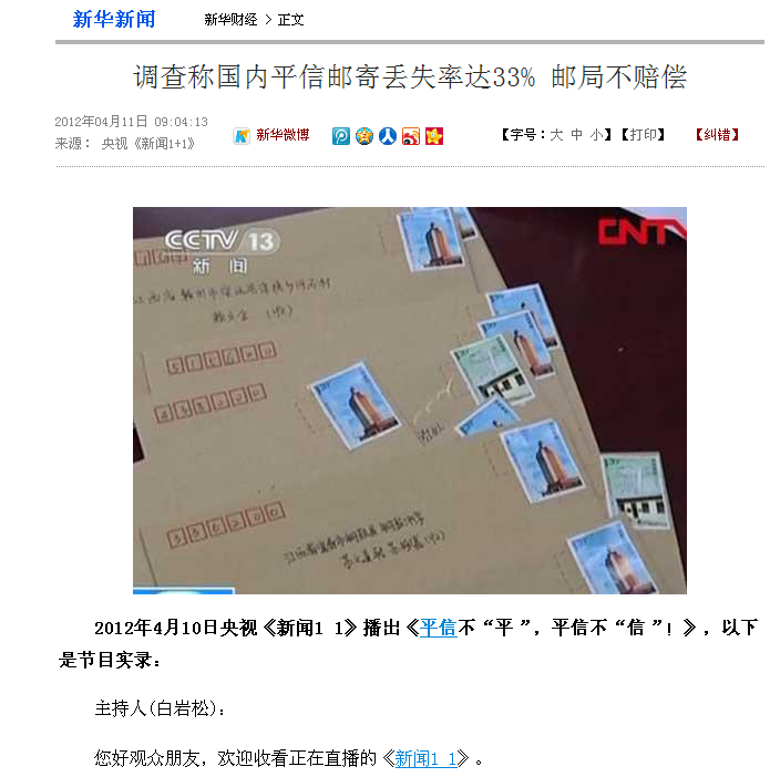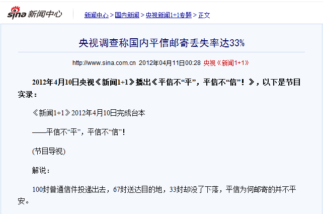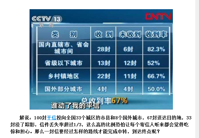 这个问题困惑了我们多年,一直不知道什么原因,直到今年(2012年)4月,中央电视台新闻1+1节目播出了《平信不“平”,平信不“信”!》:国内平信邮寄丢失率达33%,达到1/3.